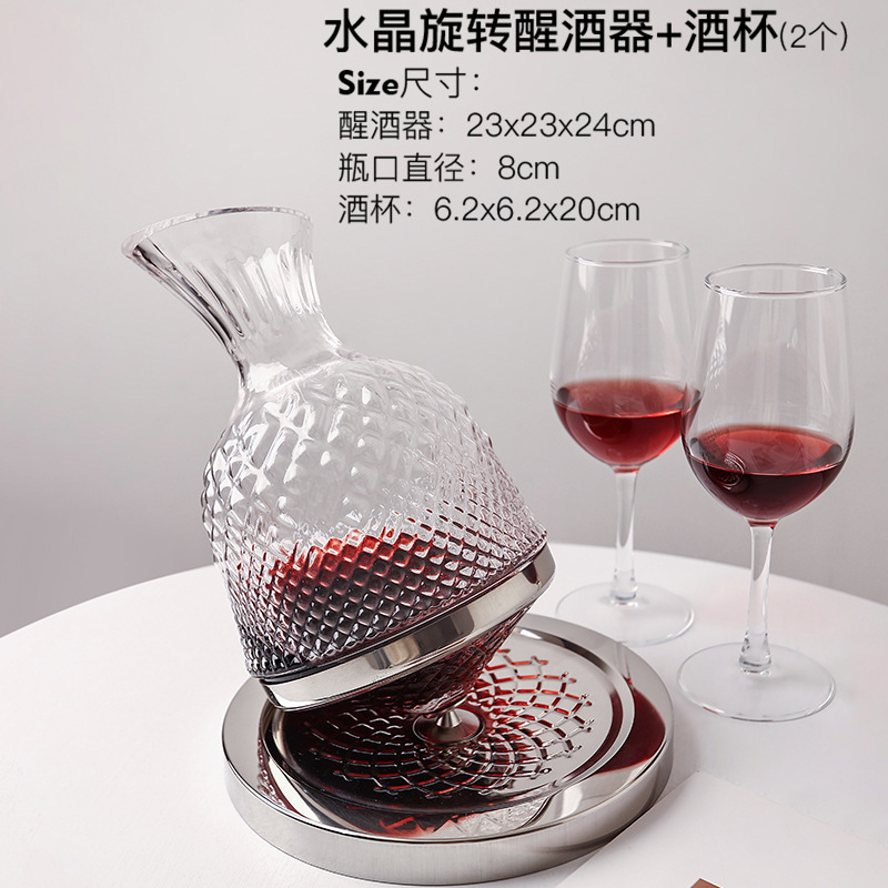 Marca: INTOWALK Nome del prodotto: decanter rotante in vetro cristallo Stile: semplicità moderna, lusso leggero Materiale del prodotto: cristallo + metallo Dimensioni: diametro 8 cm. Altezza 24 cm. Diametro fondo + piatto 23 cm descrizione dettagliata: Design del beccuccio: processo di taglio a freddo, liscio e rotondo, versamento regolare del vino Cristallino: ripristina il vero colore del buon vino, la sua lucentezza cristallina rimane nuova e durevole Design della base: base in acciaio inossidabile, fondo girevole a 360°, bellissimo design del percussore