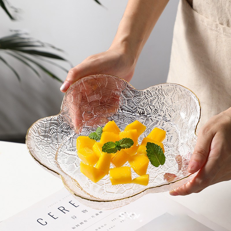 descrizione dettagliata: Il design del piatto a petalo, abbinato al vetro trasparente e strutturato, è allo stesso tempo bello e artistico. Tecnologia di tracciamento dell'oro, sicura e resistente alla luce, bocca liscia, semplice, elegante, delicata e avanzata Il design a trama poligonale, antiscivolo e strutturato, può essere abbinato a diversi frutti gourmet